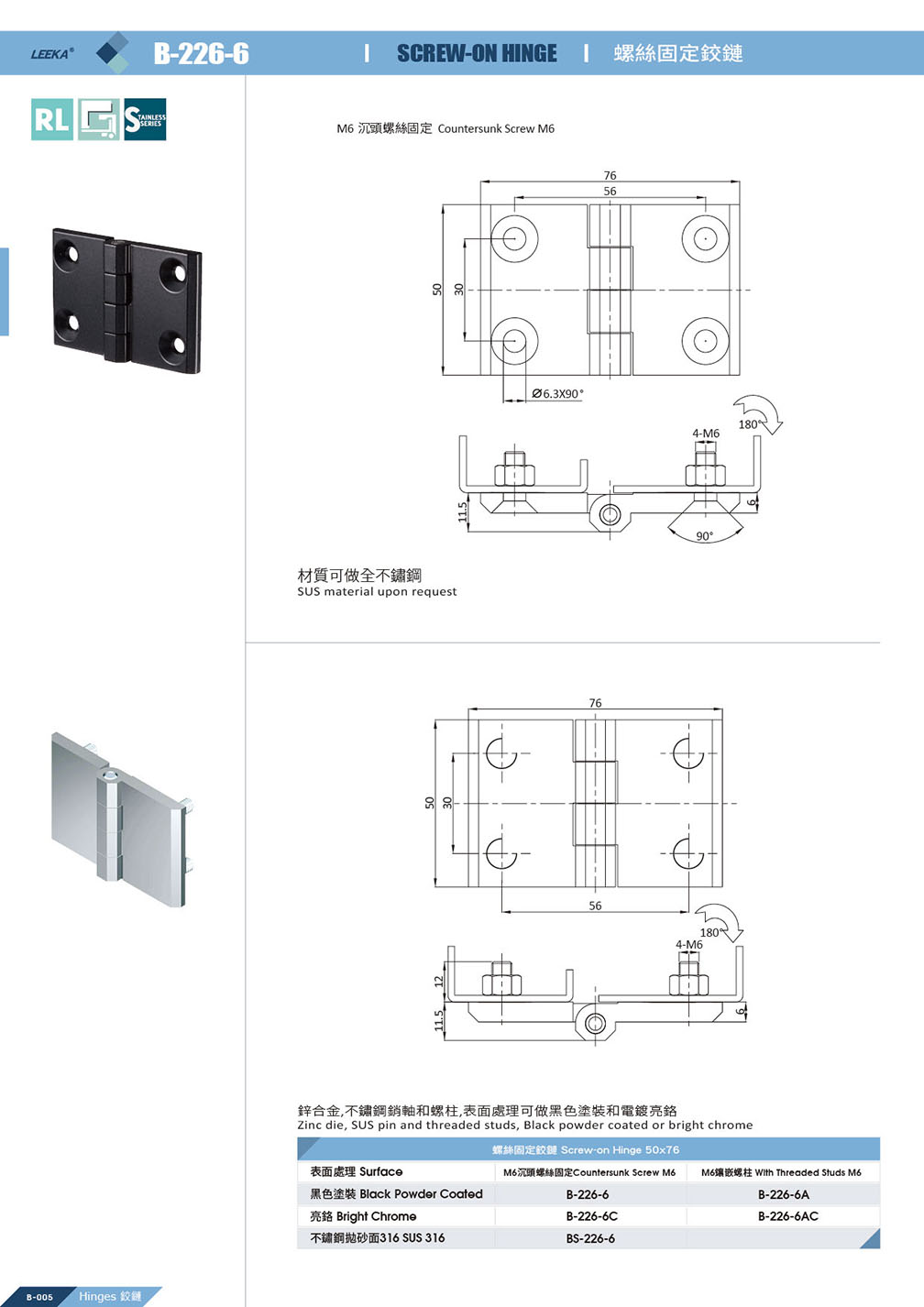 Zinc due, SUS pin and threaded studs, Black powder coated or bright chrome.