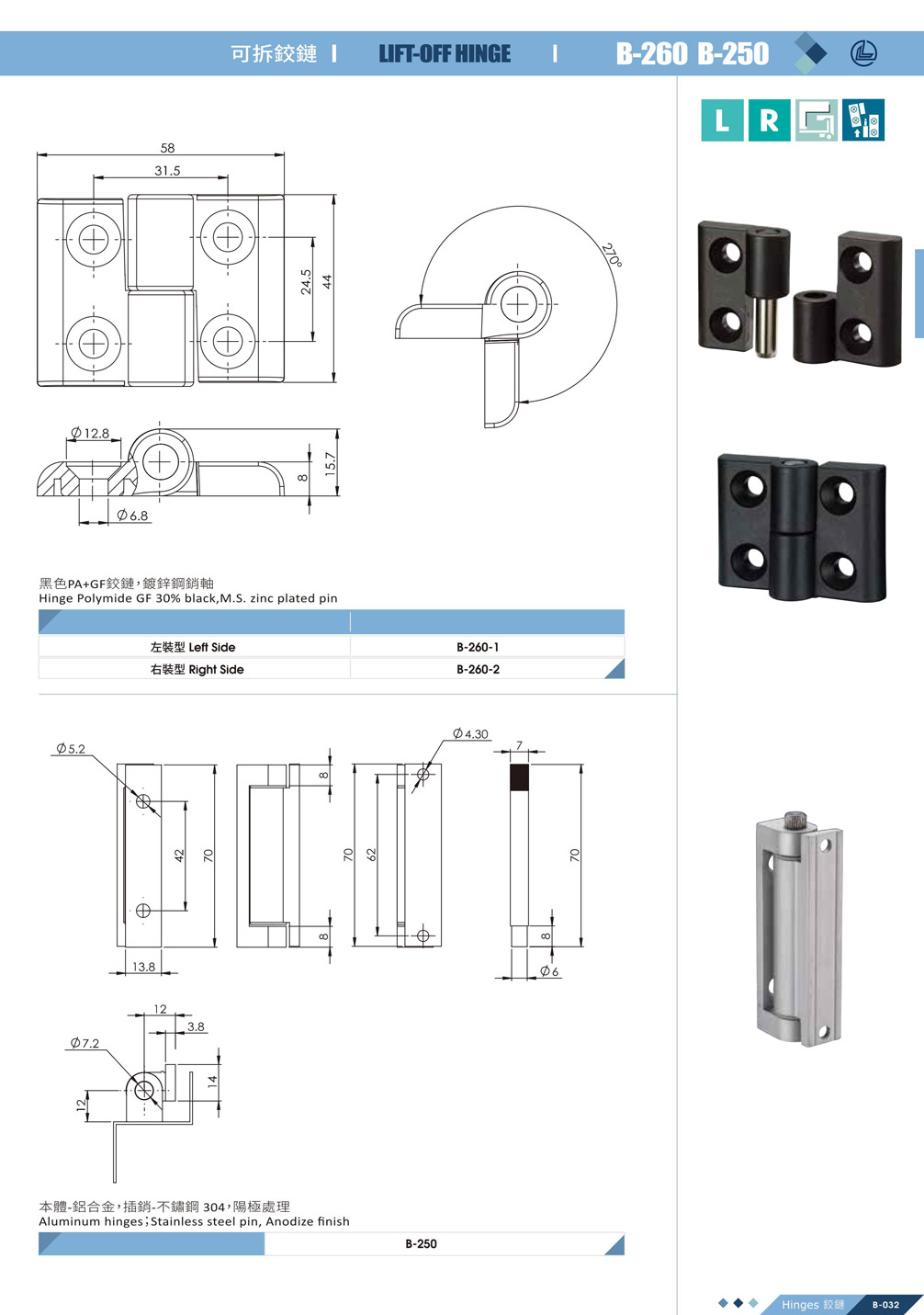 Aluminum higes; Stainless steel pin, Anodize finish.