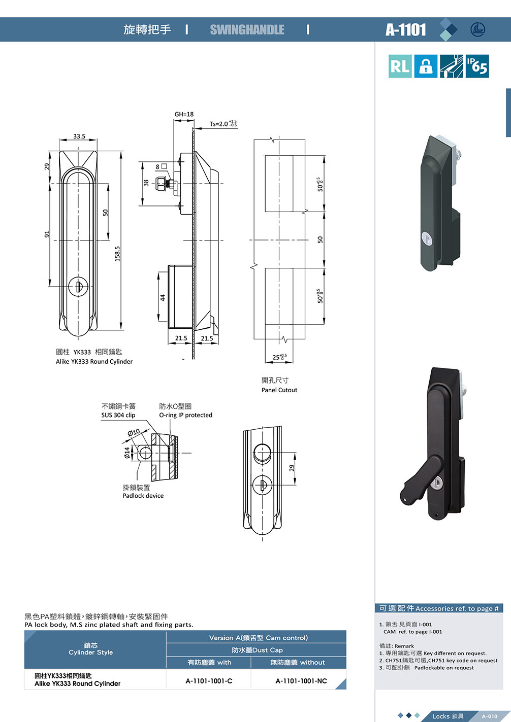 Waterproof swinghandle handle lock, with an optional dust cover. Suitable for outdoor or indoor protective enclosures, control cabinets, and similar applications.