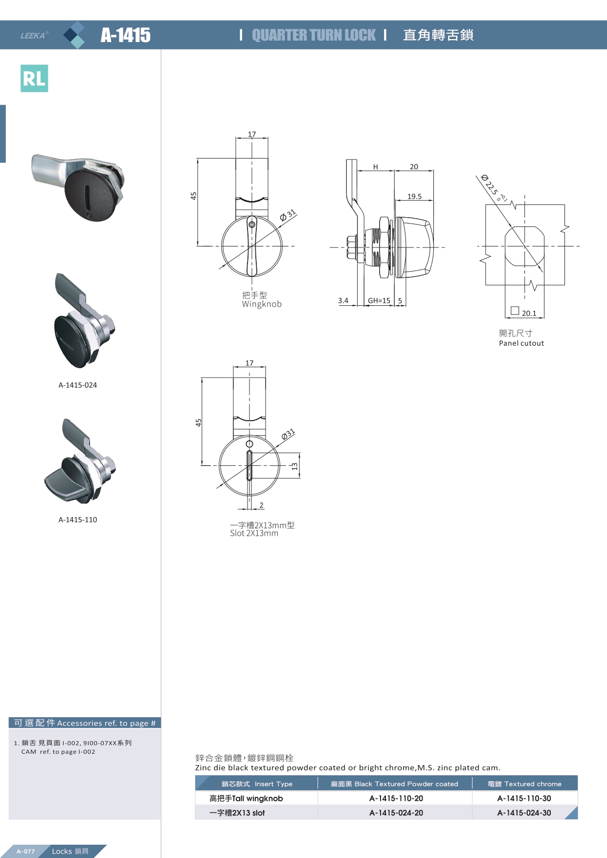 Zinc die body, black textured powder coated or bright chrome, M.S zinc plated cam.