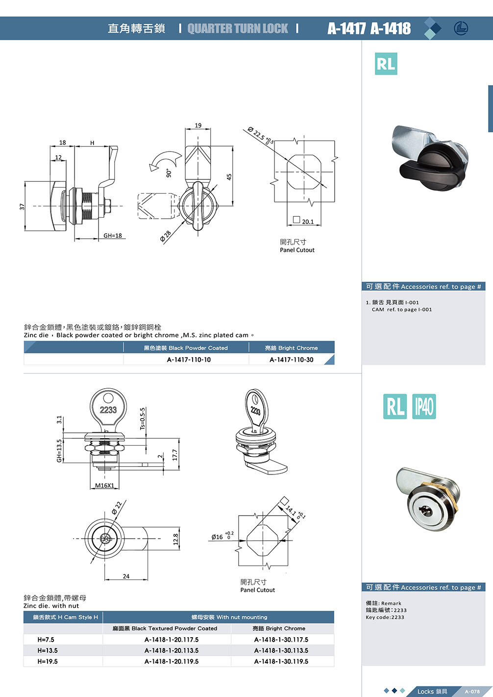Zinc die, Black powder coated or bright chrome, M.S. zinc plated cam.