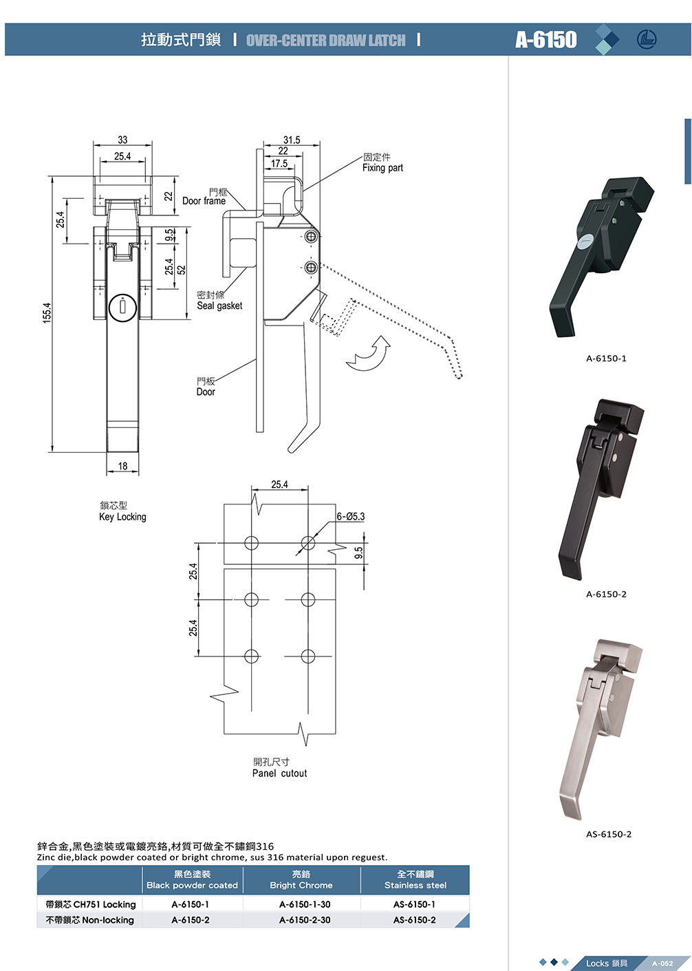 Zinc die, black powder coated or bright chrome, sus 316 material upon request.