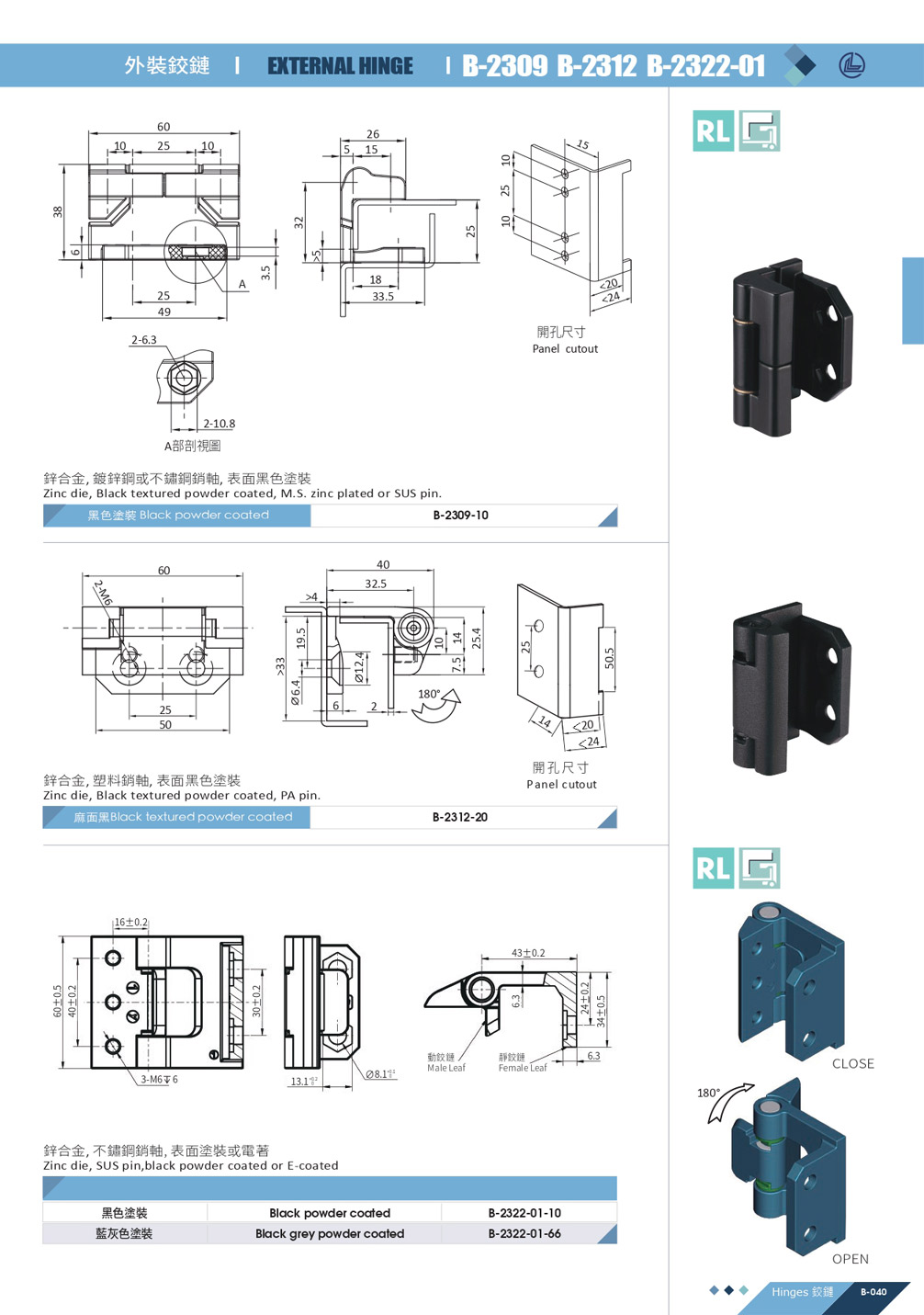 Zinc die, Black textured powder coated, M.S. zinc plated or SUS pin.